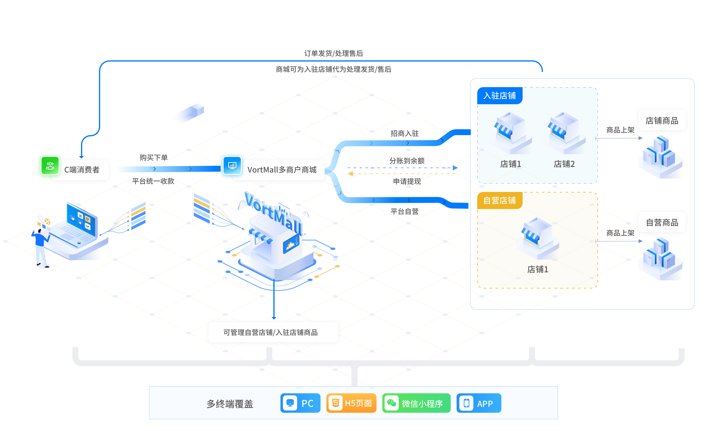 后台管理系统+PC商城+移动商城:(APP+小程序+H5) 多终端覆盖